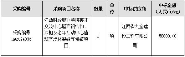 江西好望投资咨询有限公司受bat365正版唯一官网委托,就bat365正版唯一官网英才交流中心屋面钢结构、顶棚及老年活动中心值班室墙体裂缝等修缮项目(采购编号:HWZC24036)进行竞争性谈判方式采购。采购活动于2024年06月19日10:00时整在江西好望投资咨询有限公司举行。经谈判小组评审和采购人确认,成交结果如下:
