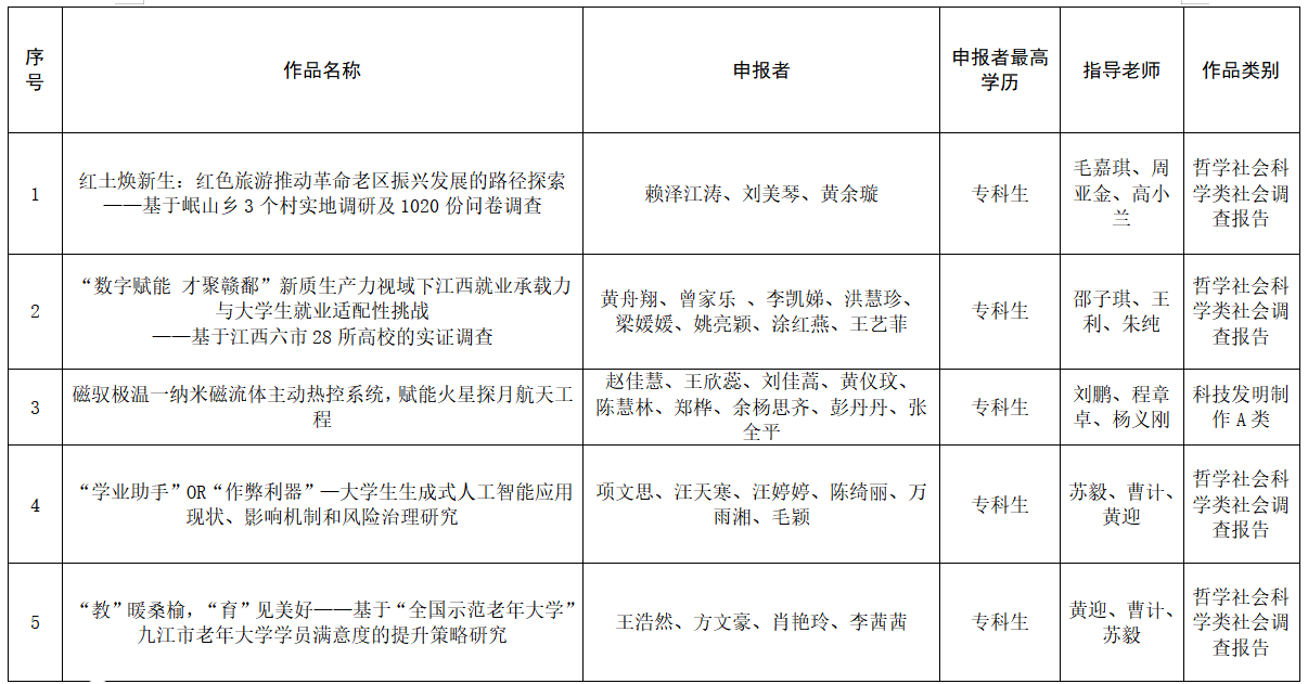 根据《关于组织开展第十九届“挑战杯”江西省大学生课外学术科技作品竞赛的预通知》要求及省团协参赛项目名额分配,经过校内初赛、决赛遴选,拟推荐1至4号作品参加第十九届“挑战杯”江西省大学生课外学术科技作品竞赛省赛,5号作品参加省团协项目推荐,现予以公示。