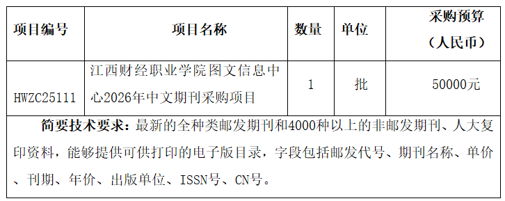 bat365正版唯一官网图文信息中心2026年中文期刊采购项目(项目编号:HWZC25111)的潜在供应商应在江西好望投资咨询有限公司(邮箱:jxhwtz@163.com)获取采购文件,并于2025年 11月 21日10点00分(北京时间)前提交响应文件。