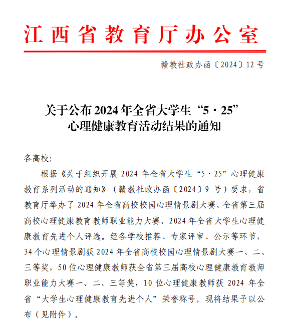 6月5日,2024年江西省高校心理健康宣传教育成果展演在江西中医药大学举行。省委教育工委委员、省教育厅副厅长汪立夏出席并致辞。省委教育工委宣传部负责人,在昌高校分管校领导、学工处处长、心理咨询中心负责人以及学生代表等近500人参加。活动为2024年江西省高校心理情景剧大赛、全省第三届高校心理健康教育教师职业能力大赛获奖选手和2024年全省“心理健康教育先进个人”颁奖。