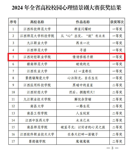 近日,江西省教育厅办公室印发了《关于公布2024年全省大学生“5·25”心理健康教育活动结果的通知》(赣教社政办函〔2024〕12号),由bat365王美娟、张亦弛、吴菁菁老师指导,张乐、胡著涛、严剑晨等二十余名同学的原创剧目《情绪修炼手册》喜获2024年江西省高校心理情景剧大赛一等奖。bat365大学生心理健康教育中心负责人王美娟获得2024年江西省大学生“心理健康教育先进个人”荣誉称号。
