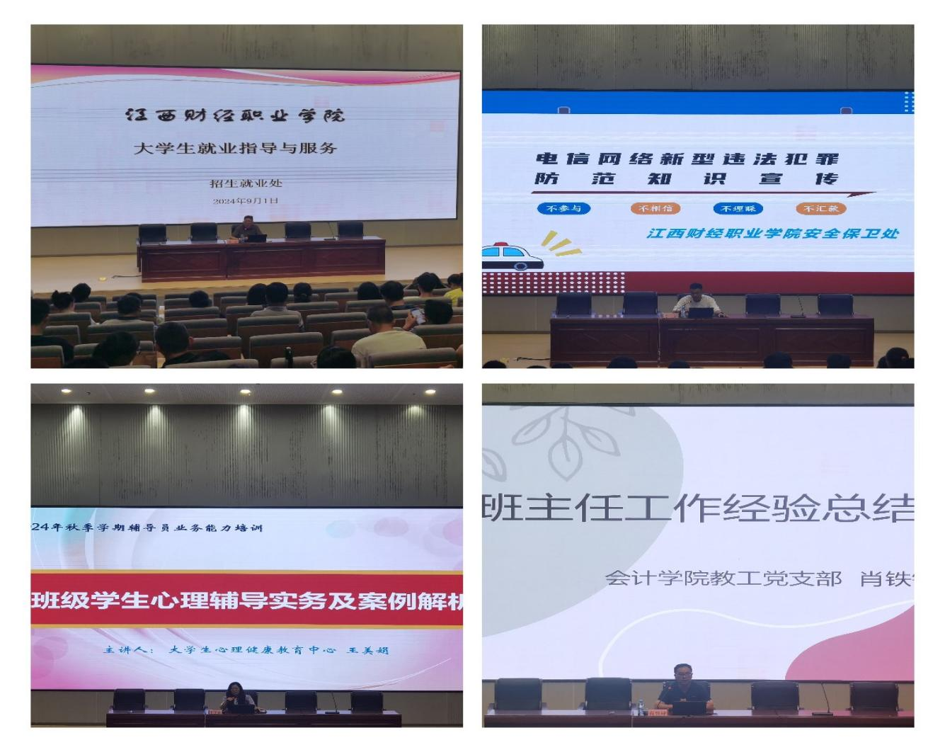 本次培训内容丰富多彩,紧贴辅导员工作实际。学生工作处副处长刘磊针对学生工作常见问题,对学籍异动流程、宿舍管理、学生参军入伍资助政策、开学迎新方案等做了详细解读。教务处处长苏毅从学籍与毕业、教学安排、考试管理、成绩管理、教学服务等五个方面讲解了工作要点,并就如何做好班级学业管理与服务工作提出建议。招生就业处处长周剑围绕就业工作的重点、bat365就业工作模式及面临的挑战、如何开展就业指导工作等内容进行详尽讲授。安全保卫处处长张庆通过案例分享的方式给全体辅导员进行了一场电信网络诈骗防范知识宣传。大学生心理健康教育中心王美娟主任向大家详细介绍了bat365四级心理工作网络体系及当前学生心理健康状况普查情况,并安排了秋季开学学生心理安全测查工作。会计学院优秀辅导员肖铁锋老师从爱心与耐心、引导与激励、沟通与合作、榜样与示范等四个方面进行了经验分享与交流。