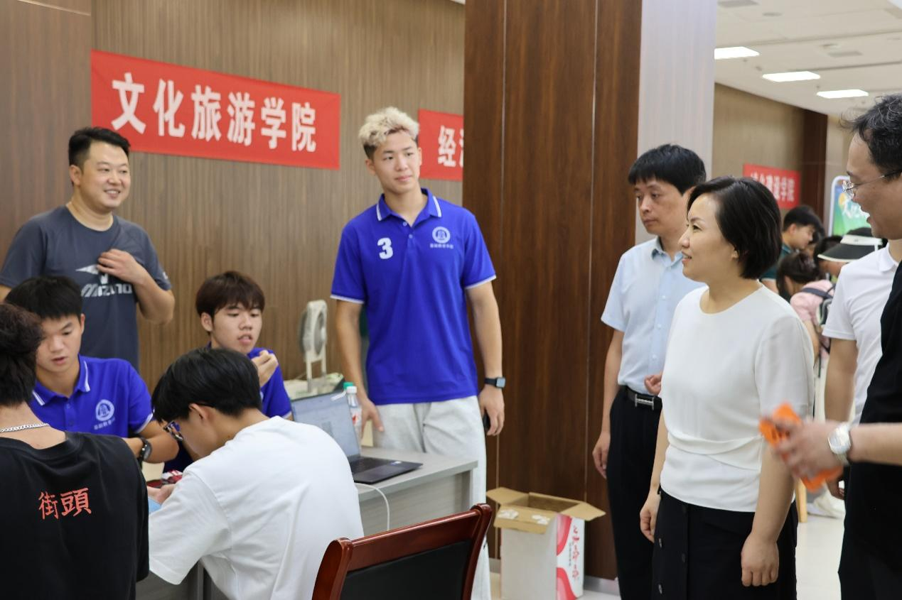 彭慧一行来到各二级学院迎新接待点,详细了解迎新物资供应、新生报到进展、迎新志愿者安排等情况。走访过程中,彭慧慰问了迎新工作人员和志愿者,对他们在迎新工作中周到细致的服务和热情奉献给予充分肯定并表示感谢,并希望大家继续做好新生及家长服务工作,确保每一位新生顺利入学。