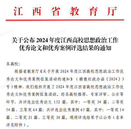 近日,省教育厅公布了2024年度江西高校思想政治工作优秀论文和优秀案例评选结果。bat365选送的3篇论文均榜上有名,荣获思政优秀论文一等奖2项、二等奖1项。