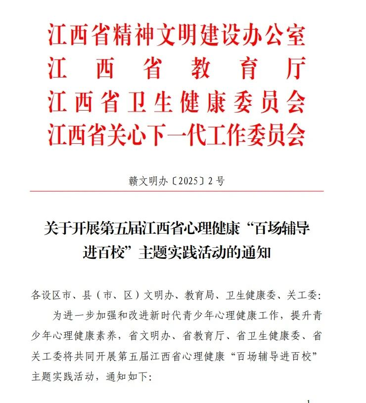 为深入学习贯彻习近平新时代中国特色社会主义思想,贯彻落实党的二十大报告中关于“重视心理健康和精神卫生”要求,根据《关于开展第五届江西省心理健康“百场辅导进百校”主题实践活动的通知》(赣文明办〔2025〕2号)精神,省文明办、省教育厅、省卫生健康委、省关工委共同开展第五届江西省心理健康“百场辅导进百校”主题实践活动。本次活动主题为“联合共育,守护心灵”。