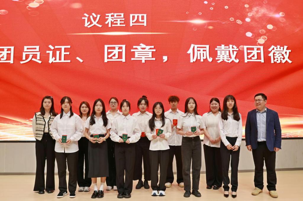 随后,歌曲《强国一代有我在》将大家带入了入团仪式环节。各团总支书记为新团员颁发了团员证、团章并佩戴团徽;全体新老团员面向团旗,高举右拳庄严宣誓:“我志愿加入中国共产主义青年团……”铿锵誓言响彻会场,彰显着新时代青年赓续红色基因的坚定决心;优秀学生团干代表经济贸易学院淦方宇、新团员代表工商管理学院周俊分别分享了自己的青春成长感悟。