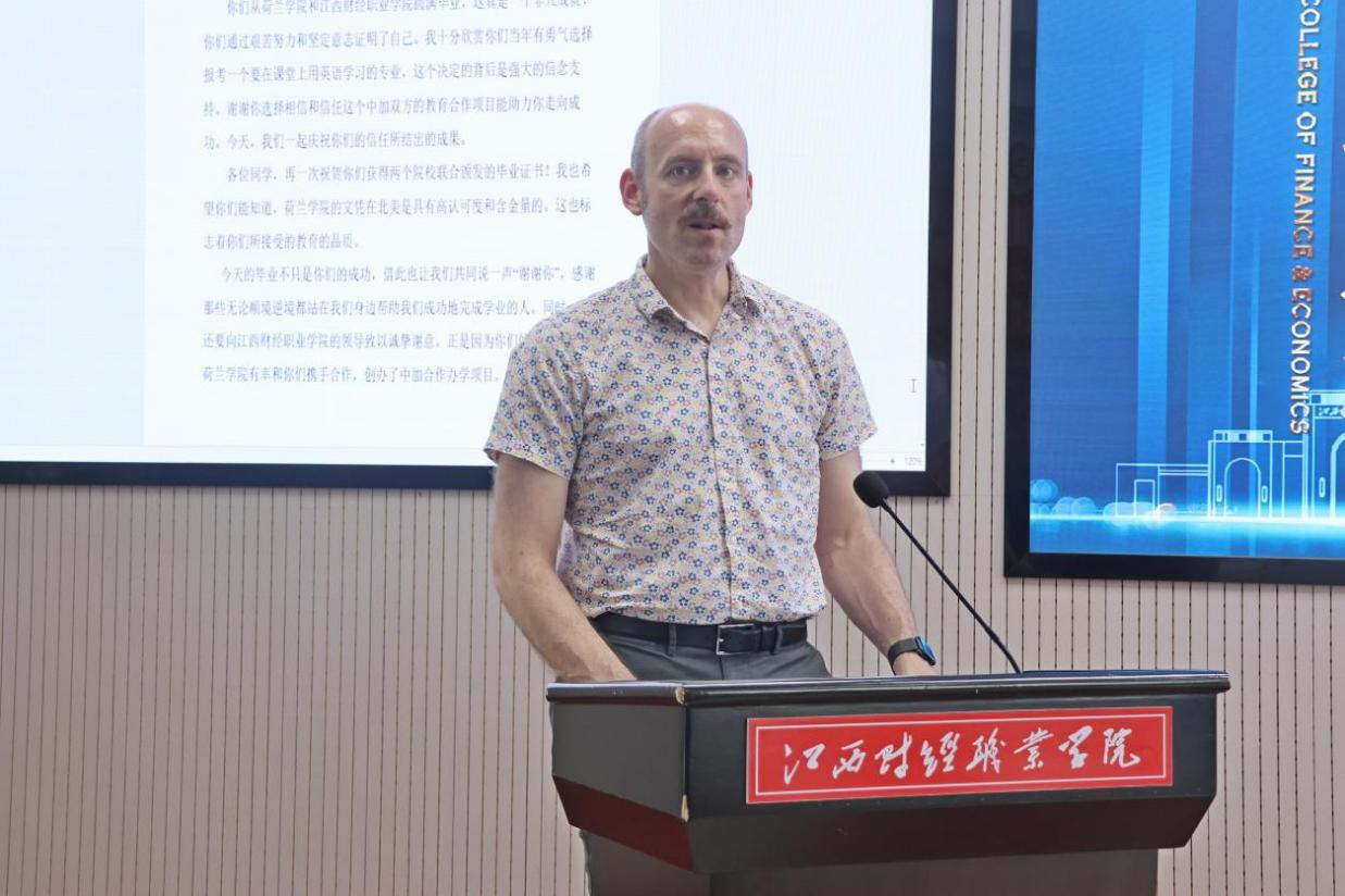 冯弋江在致辞中介绍了学校近年来的国际化办学成果,对远道而来的加拿大荷兰学院教务长Craig Dauphinee一行表示热烈欢迎,对两校老师在项目实施过程中付出的努力表示真挚的感谢,并表达了对毕业生的美好祝愿。他希望同学们以世界为课堂、永葆探索热忱,以文化为纽带、勇担时代使命,以奋斗为底色、书写青春华章,在全球化浪潮中勇立潮头,秉承“正、勤、敬、和”校训精神,努力成长为德才兼备、具有国际竞争力的新时代人才。