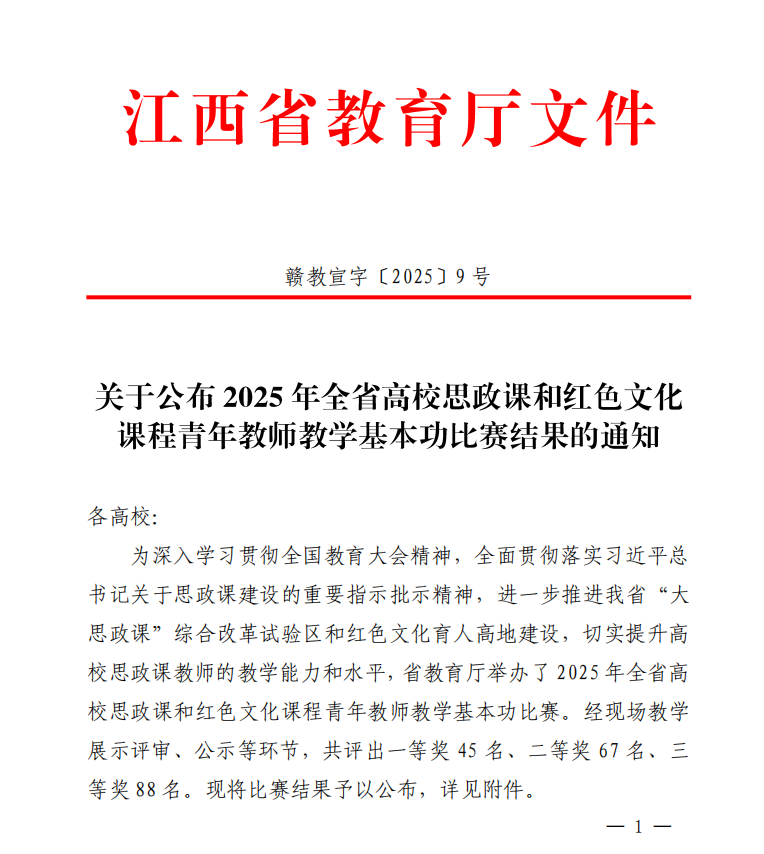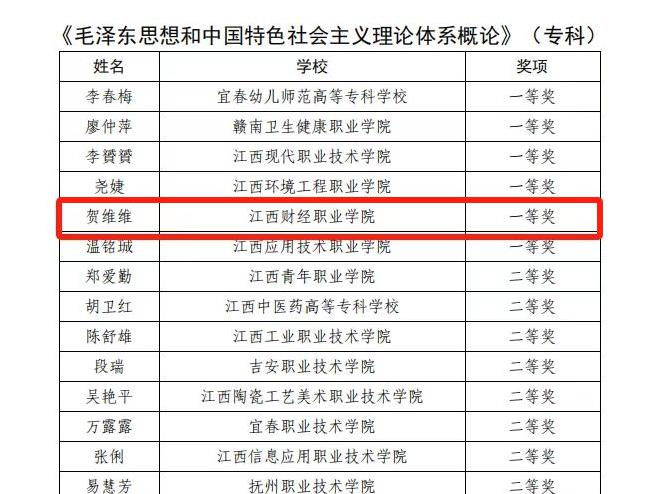 近日,由中共江西省委教育工委、江西省教育厅举办的2025年度全省高校思政课和红色文化课程教学比赛结果公布。经过激烈角逐,bat365两位思政课教师在比赛中荣获佳绩,其中,贺维维荣获“毛泽东思想和中国特色社会主义理论体系概论”课专科组一等奖,吴红金获“思想道德与法治”课专科组三等奖。