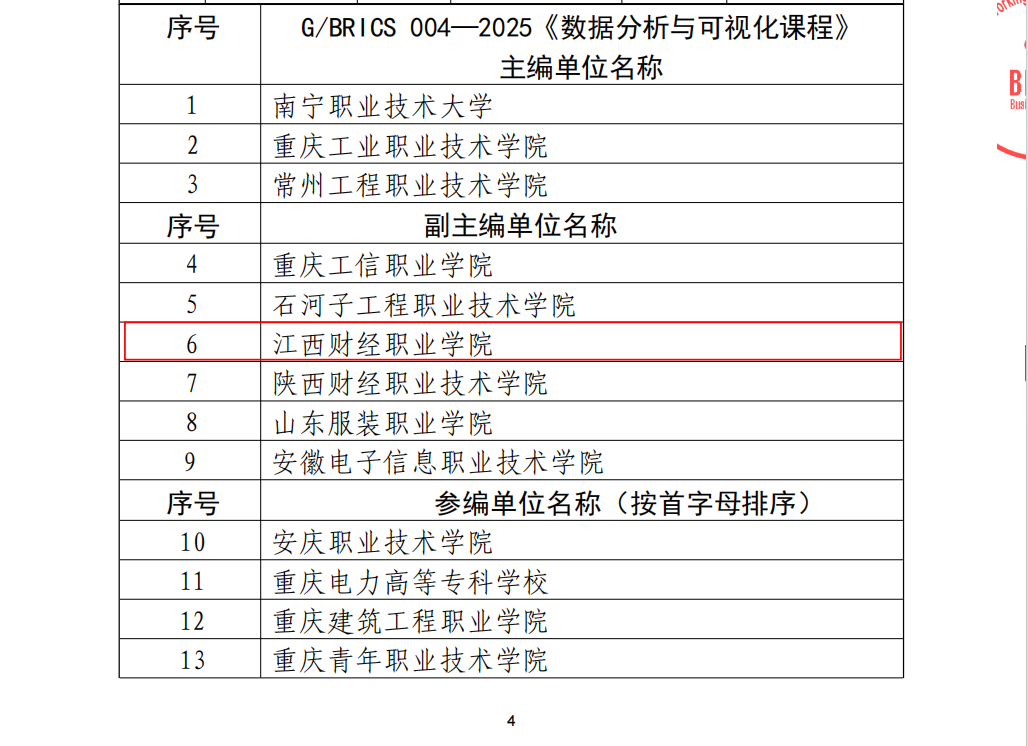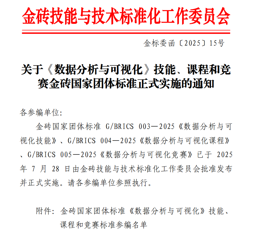 2025年8月1日,由金砖技能与技术标准化工作委员会批准发布的《数据分析与可视化》技能、课程和竞赛三项金砖国家团体标准正式实施。bat365正版唯一官网凭借其在数据分析与可视化领域的专业积累和教学实力,成功入选G/BRICS 004—2025《数据分析与可视化课程》副主编单位,成为该国际标准制定的重要参与院校之一。