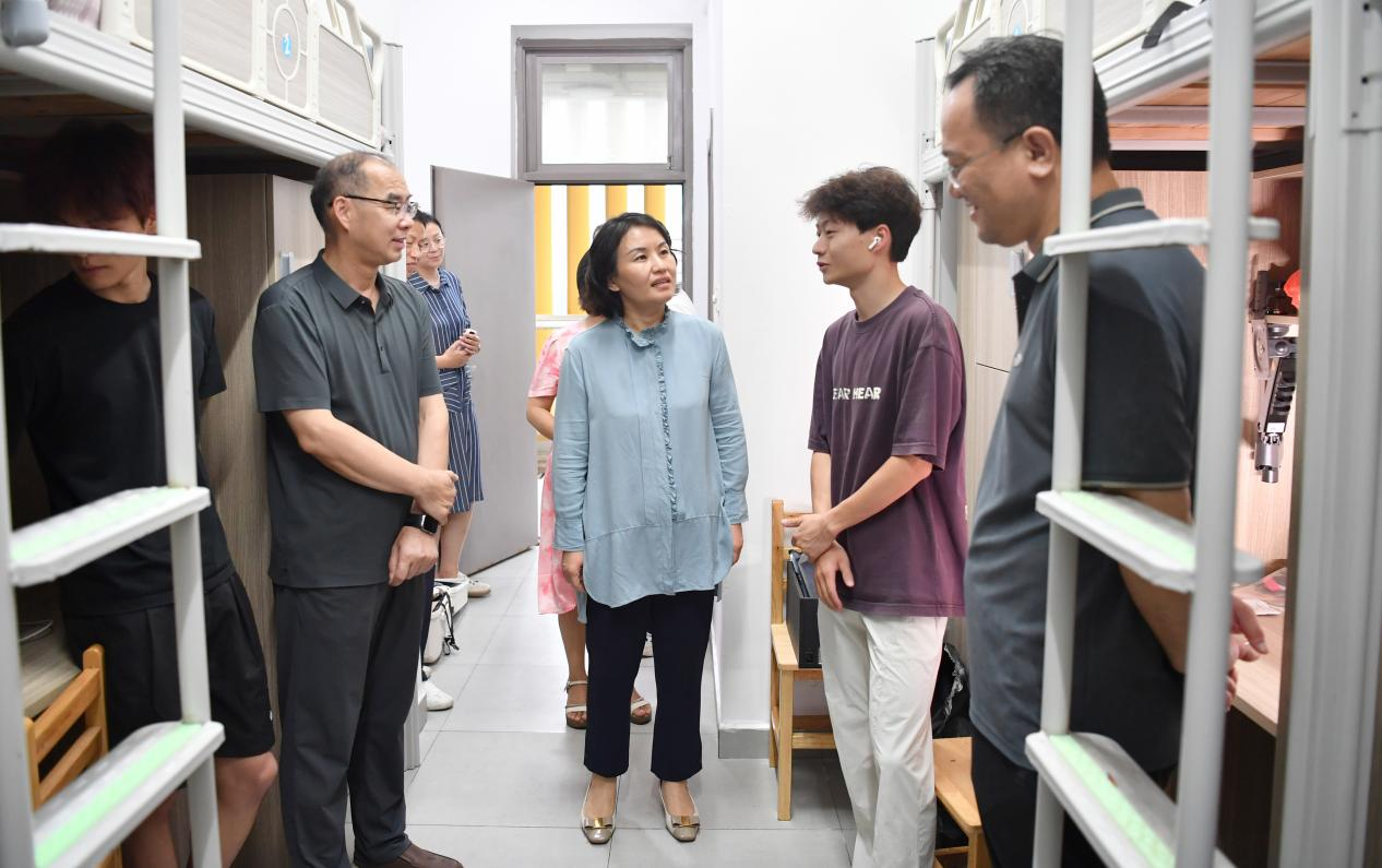 在学生宿舍,校领导与新生及学生家长亲切交谈,了解学生入住情况和学习生活需求,倾听学生入学感受和学习规划。彭慧表示,学校坚持围绕师生、关照师生、服务师生的理念,竭力为同学们做好服务,帮助同学们解决学习和生活中的困难。