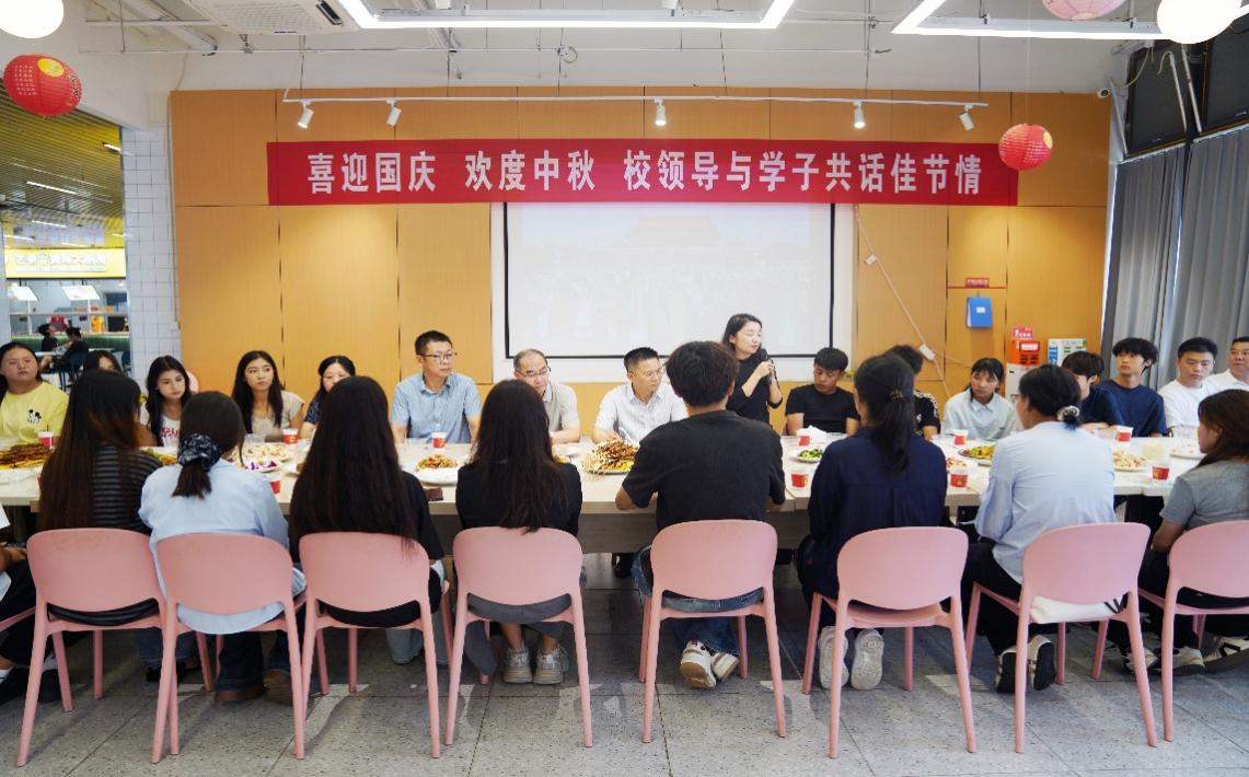 时维金秋,双节同至。10月1日中午,bat365“喜迎国庆 欢度中秋 校领导与学子共话佳节情”主题活动在八里湖校区北区食堂温馨举行。校党委书记李松志、党委副书记金小军、党委委员刘锋等亲临现场,与来自各二级学院的各民族学生代表欢聚一堂,畅谈交流,共话中华一家亲,现场洋溢着浓厚家国情怀与节日温馨。