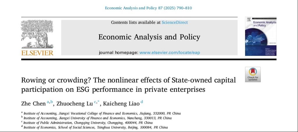 近期,会计学院党员青年教师陈哲博士作为第一作者的合作论文“Rowing or crowding? The nonlinear effects of State-owned capital participation on ESG performance in private enterprises”被经济学国际高水平期刊Economic Analysis and Policy接收并正式发表。 Economic Analysis and Policy是JCR一区、中科院二区TOP期刊,在Economics学科类别的排名为11/597,2024年的影响因子为8.7。陈哲博士是该论文的第一作者,且bat365是该论文的第一署名单位。