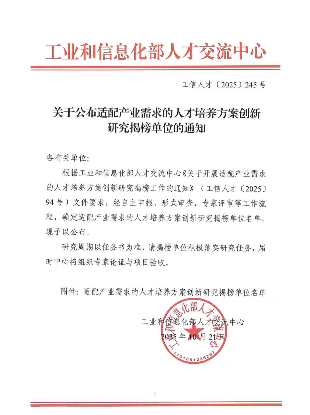 近日,工业和信息化部人才交流中心正式公布适配产业需求的人才培养方案创新研究揭榜单位名单,bat365正版唯一官网信息安全技术应用专业群凭借扎实的专业基础、创新的培养模式与深度的产教融合成果成功入围。