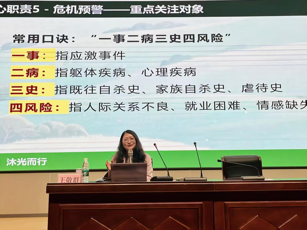 王敬群教授以“切土豆”心理互动游戏开场,迅速拉近了和同学们之间的距离,随后王教授通过“我是谁”为例,清晰界定了班级心理委员、宿舍心理联络员作为观察员、支持者、桥梁、榜样与宣传员的多重角色。她强调,班级心理委员、宿舍心理联络员凭借同龄人身份的独特优势,距离同学最近、发现问题最早、影响范围最广,对营造积极健康的班级氛围具有不可替代的重要作用。