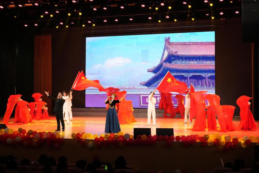 第三篇章“星璨·逐梦未来”在激昂的旋律中开启。爵士舞《大中国》与歌伴舞《我爱你中国》以动感时尚的编排和真挚演绎,舞出了新时代青年对祖国的深深礼赞;《华夏霓裳》通过华美典雅的服饰与舞步,尽显中华传统服饰文化的深厚底蕴;特色舞蹈《财苑逐光》展现了学子们昂扬向上的追梦风采。最后,晚会在教职工代表倾情献唱的大合唱《不忘初心》中圆满落幕。