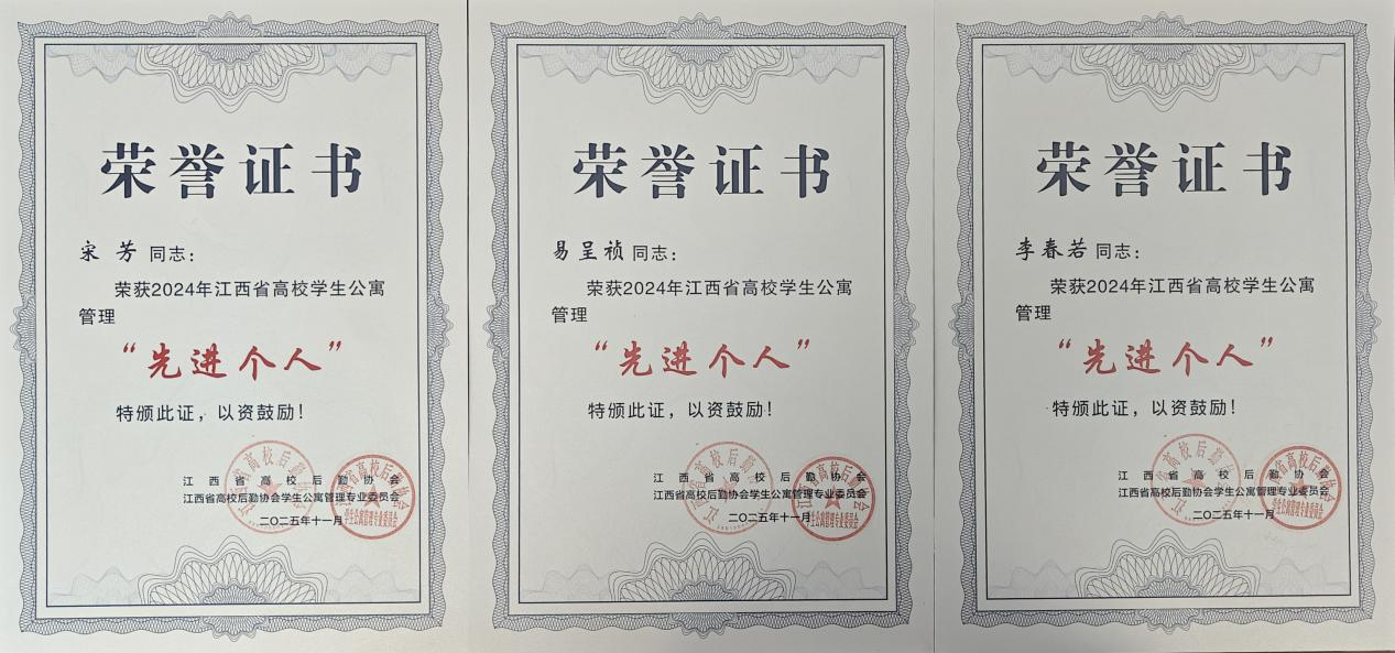 2024年度,bat365荣获“2024年度江西省高校学生公寓管理先进单位”称号,宋芳、易呈祯、李春若三位同志荣获“2024年度江西省高校学生公寓管理先进个人”称号。