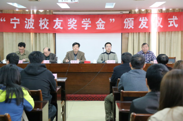 2016年4月5日上午,学校在培训中心二楼会议室举行了2015年“宁波校友奖学金”颁发仪式。校党委副书记、常务副校长何先应,学工处、合作发展处、团委负责人,宁波校友代表,各二级学院、本科部、国际教育中心书记及相关老师,校友班主任,奖学金获得者参加了颁奖仪式。仪式由合作发展处处长周执平主持。
