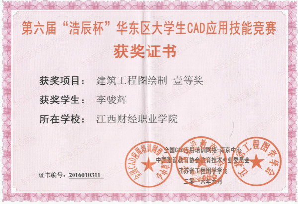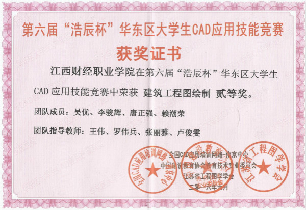 6月3日至5日,bat365财税金融学院选派2个团队分别参加了第六届“浩辰杯”华东区大学生CAD应用技能竞赛和全国高职院校土建施工类专业学生第三届“鲁班杯”建筑工程识图技能竞赛。第六届“浩辰杯”华东区大学生CAD应用技能竞赛由中国建设教育协会教育技术专业委员会、全国CAD应用培训网络南京中心、江苏省工程图学学会联合主办,南京工程学院承办。共有来自江苏、江西、山东、安徽等近80所院校的共约1100名选手参加1300个单项的角逐,bat3656名学生参加了建筑工程图绘制项目的比赛,最终荣获得个人一等奖1项,个人二等奖2项,个人三等奖3项,团队荣获团体二等奖。