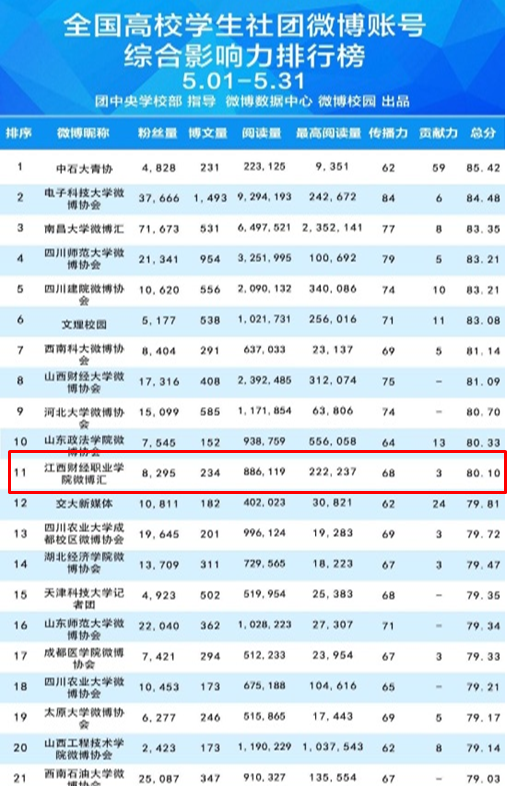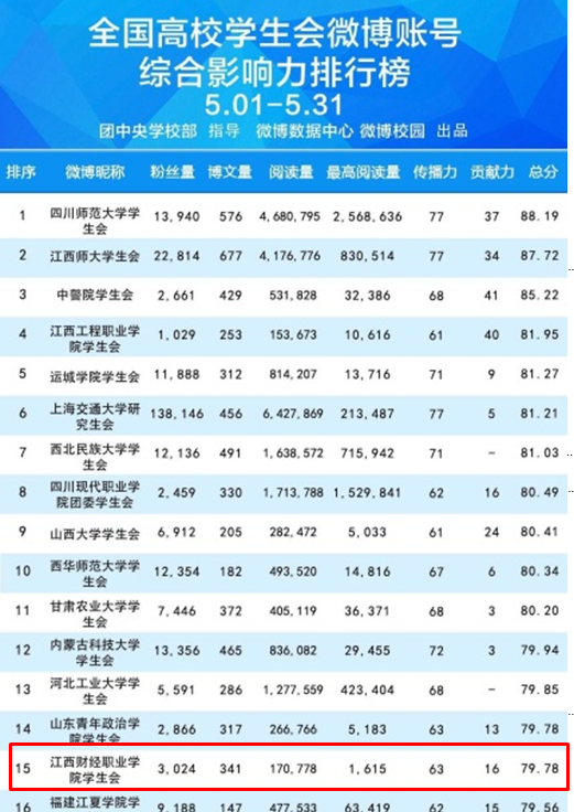 日前,共青团中央学校部发布2016年5月全国高校学生会微博账号综合影响力排行榜和高校学生社团微博账号综合影响力排行榜,bat365学生会官方微博“@bat365正版唯一官网学生会”及社团微博“@bat365正版唯一官网微博汇”分别获得第十五名和十一名。