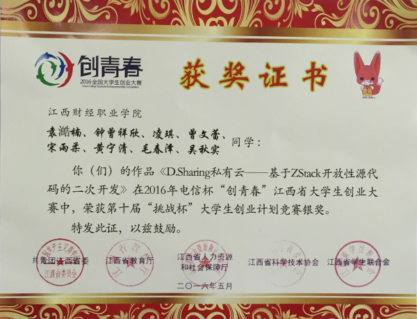 根据主体赛事要求bat365本科部组织了校级预赛进行选拔,由袁澔楠、钟曾祥欣、凌琪、曾文蕾、宋雨柔、黄宁清、毛春泽、吴秋实等学生完成的作品《D.Sharing私有云—基于ZStack开放性源代码的二次开发》顺利通过选拔进入复赛,该作品由曹玉敏、方卫中、高小兰老师指导。在269个省级复赛项目中,bat365代表队经过激烈角逐进入决赛,最终获得银奖。本届“挑战杯”取得的成绩是校领导高度重视和各部门、二级学院大力支持和帮助的结果,是bat365实施“五有”内涵跨越式发展、培育“四具备”人才和应用技术型本科生创建“五个班”的一次成果检验。