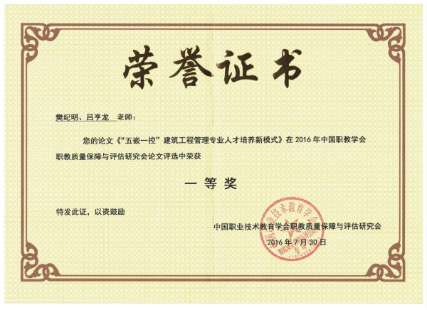 根据中国职业技术教育学会职教质量保障与评估研究委员会和教育部职业技术教育中心研究所联合发布的《关于开展“高等 职业院校质量保障优秀案例”征集活动的通知》(职教所〔2016〕 37 号)要求,在学院领导和相关部门的指导下,财税金融学院樊纪明院长、吕亨龙副院长共同撰写的典型案例《“五嵌一控”建筑工程管理专业人才培养新模式》代表学院参加评选,并获得了一等奖,展示了bat365职业教育质量保障与评估领域研究的最新进展。