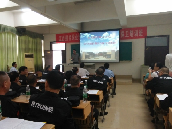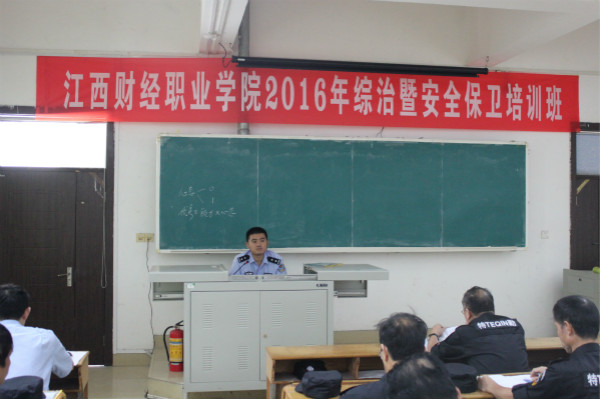 为全面提高学院安保人员的综合素质和业务能力,提升校园安全防控水平,2016年8月26日-28日,为期三天的2016年综治暨安全保卫工作培训班在综合楼二楼阶二教室举行,安全保卫处全体工作人员、九江洁美物业公司管理人员、学院全体保安、学生宿管人员等60余人集中参加了 “安保人员行为规范”、“保安岗位工作规范”、“保安基本技能”、“校园反恐防暴知识”、“校园消防安全知识”等内容培训。