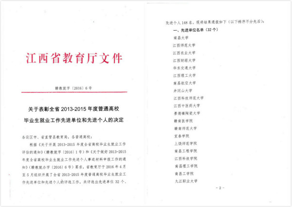 近日,从江西省教育厅《关于2013-2015年度全省普通高校毕业生就业工作评估结果的通报》(赣教就字[2016]5号)、《关于表彰全省2013-2015年度普通高校毕业生就业工作先进单位和先进个人的决定》(赣教就字[2016]6号)中获悉,bat365在江西省2013-2015年度普通高校毕业生就业工作评估中被评为“优秀等级学校”,并荣获“就业工作先进单位”称号,这也标志着bat365连续12年获此殊荣。