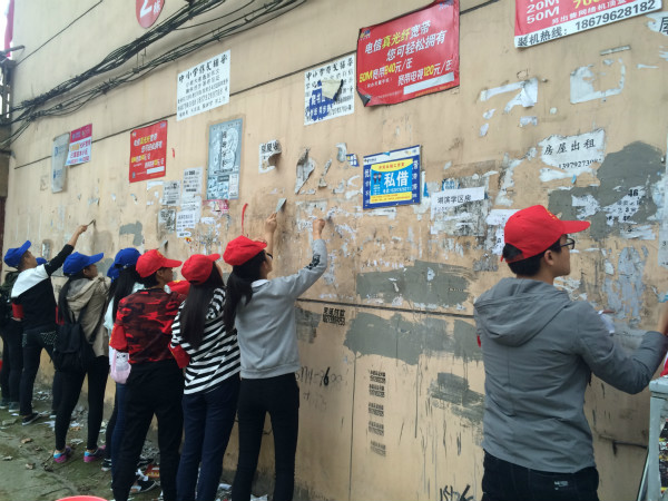 在庐南社区有些居民楼靠近道路一面的墙体上,贴满了各式各样、五花八门的小广告,严重影响了社区的整体形象。志愿者们来到社区,用自带的小铲子铲刮这些“牛皮鲜”,并用清水对墙体进行清洗,经过一个多小时的奋战,以前的“牛皮鲜”不见了,墙体又恢复了往日的光洁。