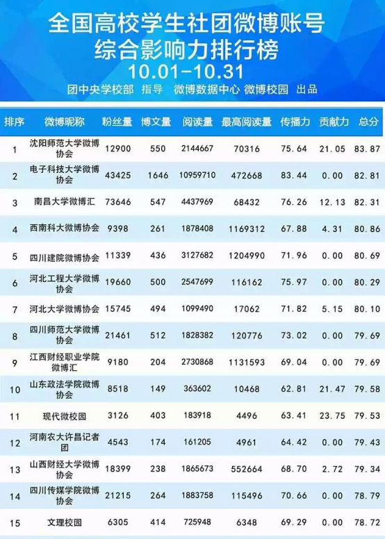 日前,共青团中央学校部发布2016年10月全国高校微博账号综合影响力排行榜,bat365社团官方微博“@bat365正版唯一官网微博汇”突破五月全国十一名的成绩获得全国第九名。