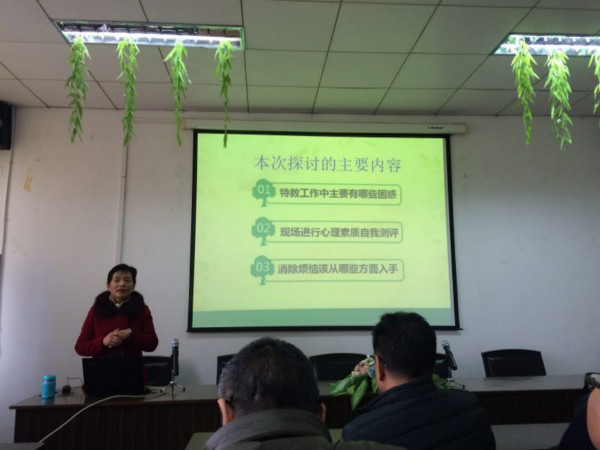随后,bat365离退休党总支宣传委员丁正员教授应九江市心理学会邀请,以讲座形式为该校全体老师作了一场题为《以平和心面对特殊教育》的心理健康辅导报告。约一小时的专题辅导,既有心理测评,又有现场答疑;既有经典解释,又有个案分析,课堂氛围异常活跃,不少老师积极参与互动。九江市心理学会会长黄福林与副会长刘新发两位领导以嘉宾身份自始至终随堂听课。