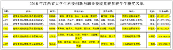 近日,从江西省教育厅网站获悉,bat365学生在2016年江西省大学生科技创新与职业技能竞赛(专科组)市场营销实战和沙盘模拟经营赛项中再创佳绩,共获得一等奖4项,曹玉敏、易娇艳等老师荣获了“优秀指导教师”称号。