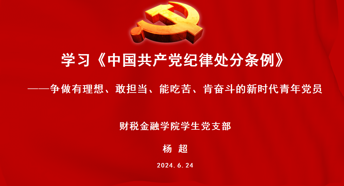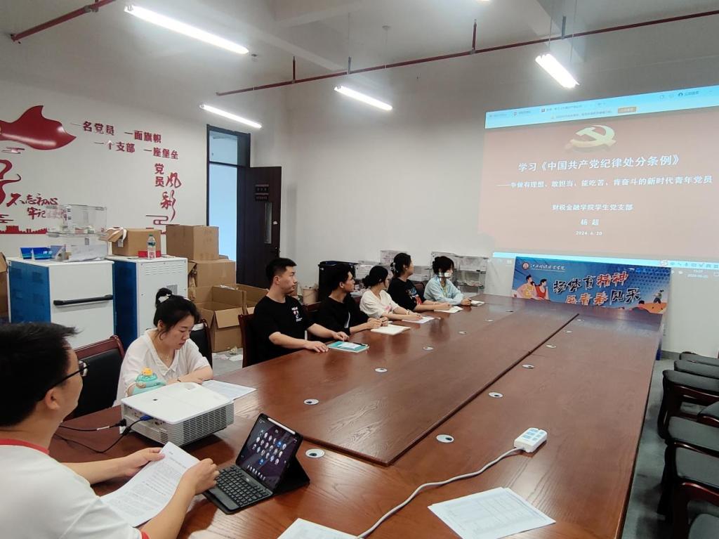 为进一步筑牢学生党员的党性根基,强化纪律意识,财税金融学院学生党支部于6月24日下午在八里湖校区洙泗学馆B101会议室召开了“学习《中国共产党纪律处分条例》——争做有理想、敢担当、能吃苦、肯奋斗的新时代青年党员”的党纪学习教育专题党课。此次党课由学生党支部书记杨主讲,21级专科、22级本科的毕业生党员通过线上形式参与,非毕业生党员线下参加了此次学习。