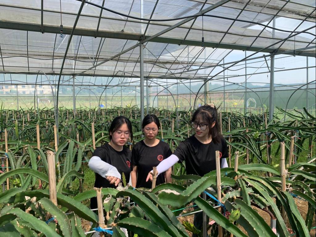 随后,实践队来到了火龙果种植园区,队员们被这片充满生机的绿色所吸引。他们认真聆听了刘总关于火龙果种植技术的介绍,并纷纷提出了自己的见解和想法。其中,网络直播销售的想法得到了大家的广泛认可,通过直播,消费者可以更加直观地看到火龙果从生长到成熟的全过程,这无疑将进一步拓宽火龙果的销售渠道,提升产品的知名度和市场竞争力。在交流过程中,有队员向刘总询问了关于自身所学知识能否应用在相关农业领域的问题,刘总十分热情地向队员们介绍了产业园所运用的技术,如智能控温调节、实时检测系统等。这些技术都是队员们所学的专业知识运用,鼓励他们将所学计算机相关知识转化为实践成果,为农业发展贡献自己的力量。