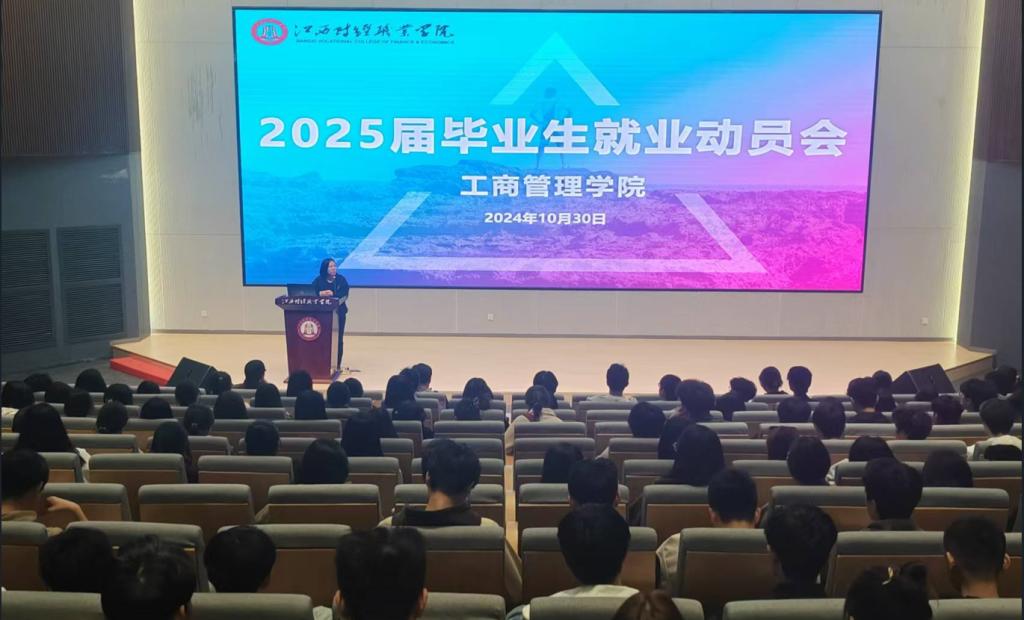 为促进2025届毕业生充分了解就业形势,引导同学们进行合理就业升学规划,助推高质量就业,工商管理学院于10月30日下午,在行政楼一号报告厅召开了2025届毕业生就业动员大会。2025届全体本、专科毕业学生、班主任及学院党政班子成员参加会议。