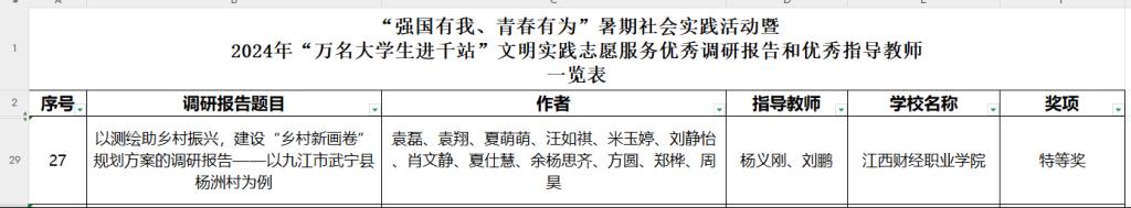 城乡建设学院“浔梦杨洲”社会实践队赴九江市武宁县杨洲村开展暑期“三下乡”社会实践活动。团队以专业技术深度参与乡村振兴建设,取得丰硕成果,获评江西省委宣传部、江西省教育厅等四部门联合颁发的“优秀实践团队”称号、调研报告特等奖等多项荣誉。