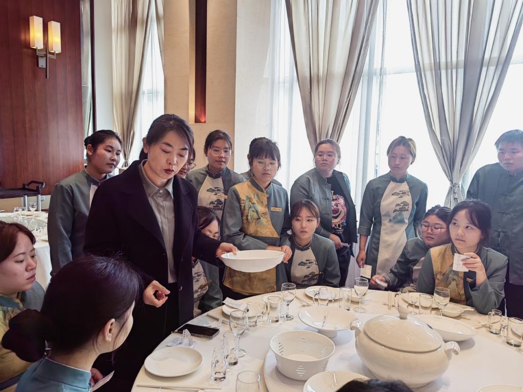 实践期间,酒店围绕会务服务核心技能开展系统培训,培训内容涵盖托盘技巧、餐布铺设、摆台标准、酒水服务、菜品报备、撤盘规范等全流程。酒店管理人员通过严格的计分规则和实时反馈,帮助学生提升服务规范性。严谨的管理体系、高标准的服务要求以及企业导师们的敬业精神,让学生们深刻体会到行业一线对专业素养的重视。