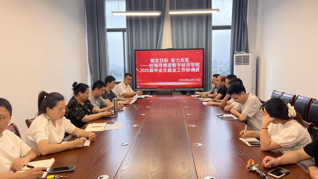 6月19日下午,数字经济学院在一教B401会议室召开2025届毕业生就业工作推进会,校党委委员刘锋、招就处处长周剑一行莅临指导。本次会议以“锚定目标 奋力攻坚”为主题,数字经济学院党政班子、2025届毕业班全体班主任参加会议。