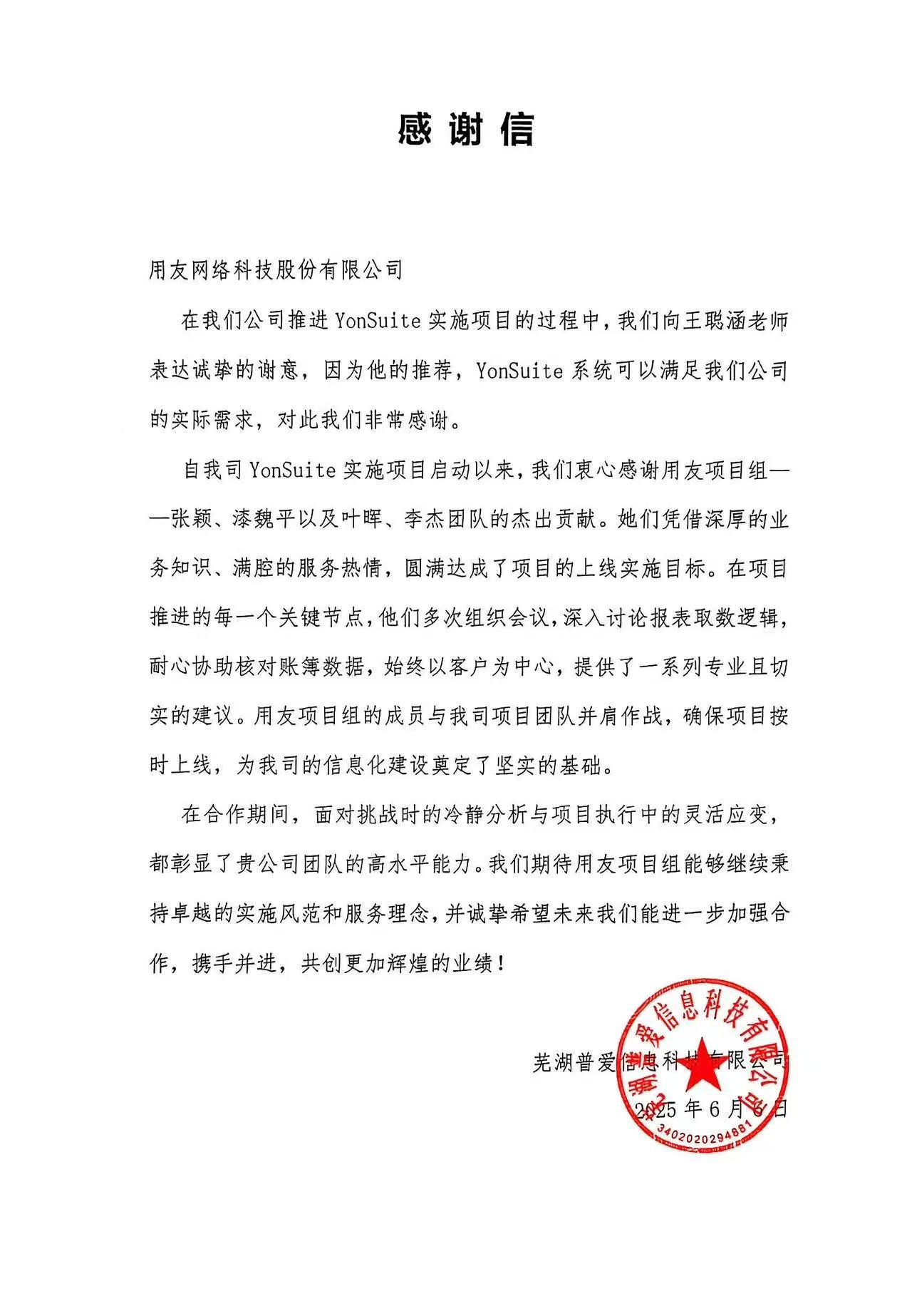 近日,会计学院智能会计现场工程师项目收到芜湖普爱信息科技有限公司专程发来的感谢信,信中对会计学院教师李杰、叶晖带领的学生团队同用友公司一起实施的YonSuite系统项目中作出的突出贡献表示高度认可与诚挚感谢。