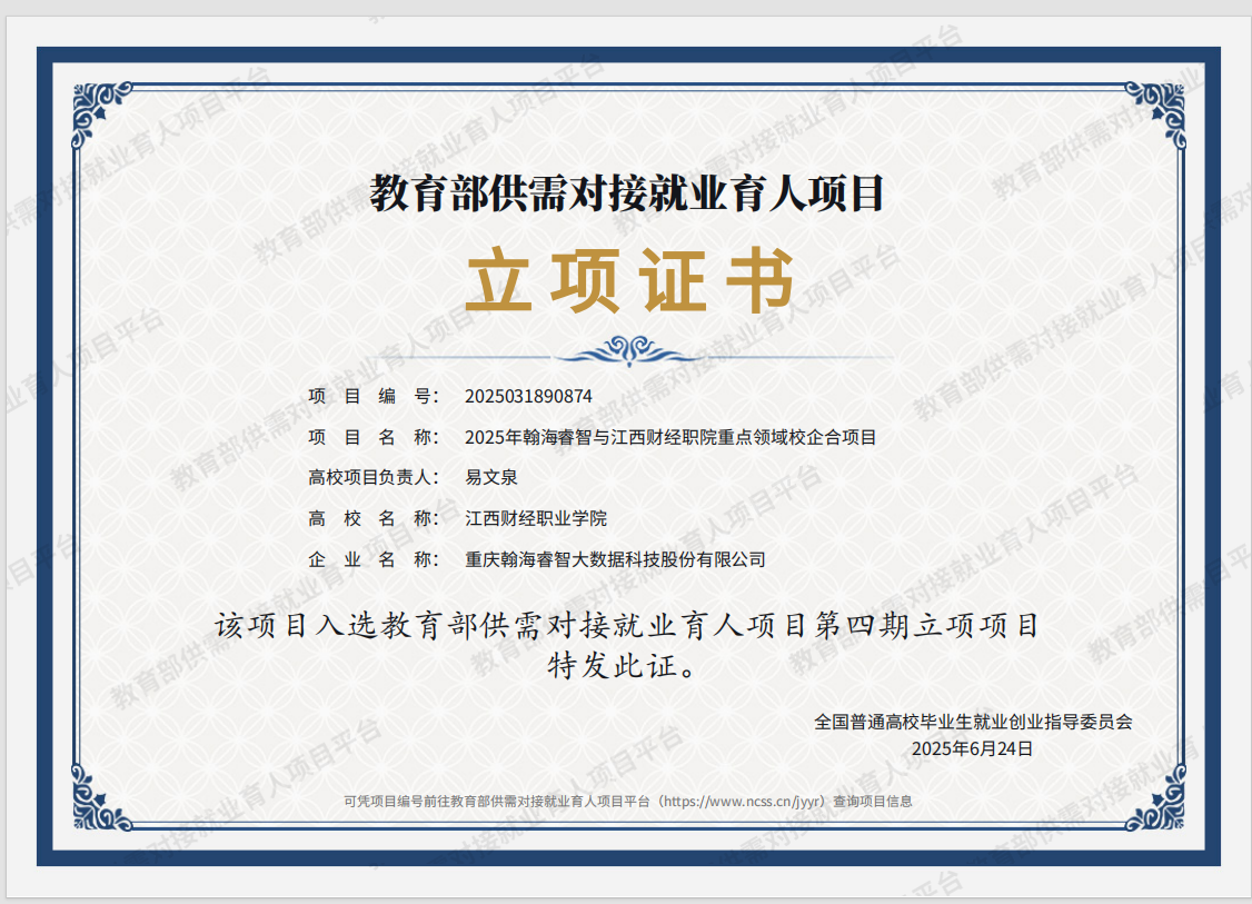 2025年6月24日,bat365正版唯一官网与重庆翰海睿智大数据科技股份有限公司联合申报的“2025年翰海睿智与江西财经职院重点领域校企合作项目”成功获批教育部第四期供需对接就业育人项目立项。这一重要成果标志着双方在深化产教融合、推动大数据技术人才培养与产业需求精准对接方面迈出坚实一步。
