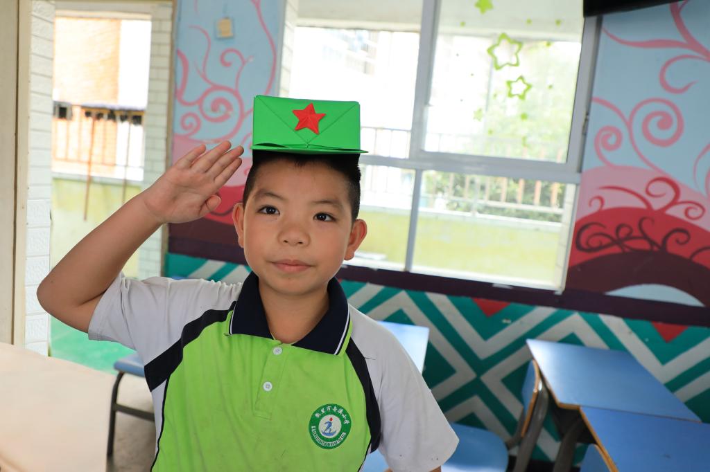 队员们耐心地教孩子们折军帽,简单的折纸过程充满了仪式感。他们一边用普通话耐心讲解折纸步骤,一边讲述军帽所代表的军人精神和红色意义。孩子们认真地学习折纸,小心翼翼地折好每一个角,戴上亲手折好的军帽,眼神中满是自豪与坚定。小小的军帽,承载着孩子们对军人的崇敬,更寄托着他们立志传承红色精神的美好愿望。