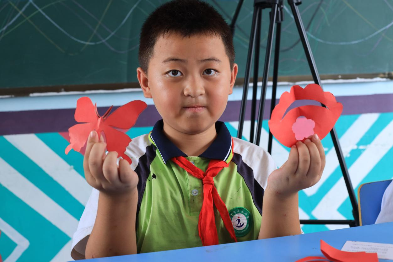 实践队员们在学习贵州非遗技艺的同时,也将江西瑞昌剪纸艺术带进了当地课堂。当队员们展示自己的剪纸作品时,孩子们眼中闪烁着好奇的光芒。“来,先把彩纸对折三次,像叠小扇子一样……”队员们耐心示范每个步骤,孩子们专注聆听,从笨拙到熟练,很快剪出了灵动的窗花和生肖图案。“老师,我的蝴蝶会飞!”孩子们举着自己的作品,脸上洋溢着自豪的笑容。为了巩固学习效果,队员们还特别设计了“剪纸造句”游戏,鼓励孩子们用普通话为自己的剪纸作品编创小故事。这种寓教于乐的方式,既让孩子们感受到传统剪纸艺术的魅力,又在轻松愉快的氛围中锻炼了普通话表达能力,实现了非遗文化传承与语言学习的完美融合。