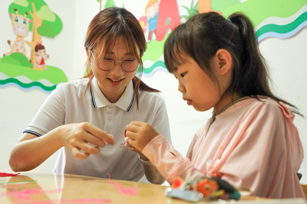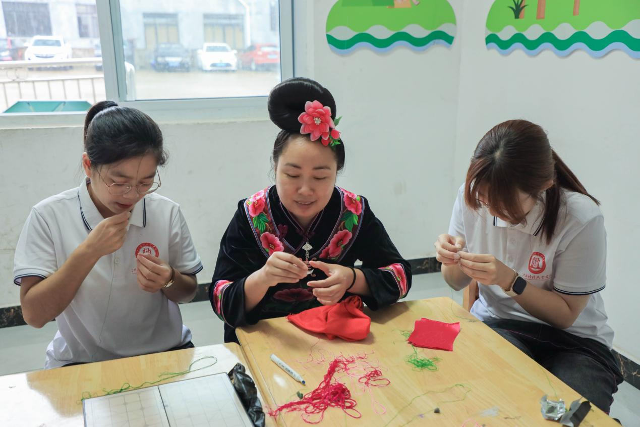 “姐姐,‘盘针绣’的‘盘’字怎么读呀?”苗家小姑娘佳怡举着未完工的蝴蝶绣片,眨着大眼睛问道。实践队员拿出拼音卡片,一字一句地教她。在苗绣小课堂上,孩子们不仅学刺绣,还学普通话。他们用稚嫩的声音讲述苗绣故事,有的甚至成了家里的“文化小使者”,把学到的知识讲给远方的父母听。“我要学好苗绣,也要学好普通话,让更多人知道我们的文化!”佳怡的话语里满是自豪。