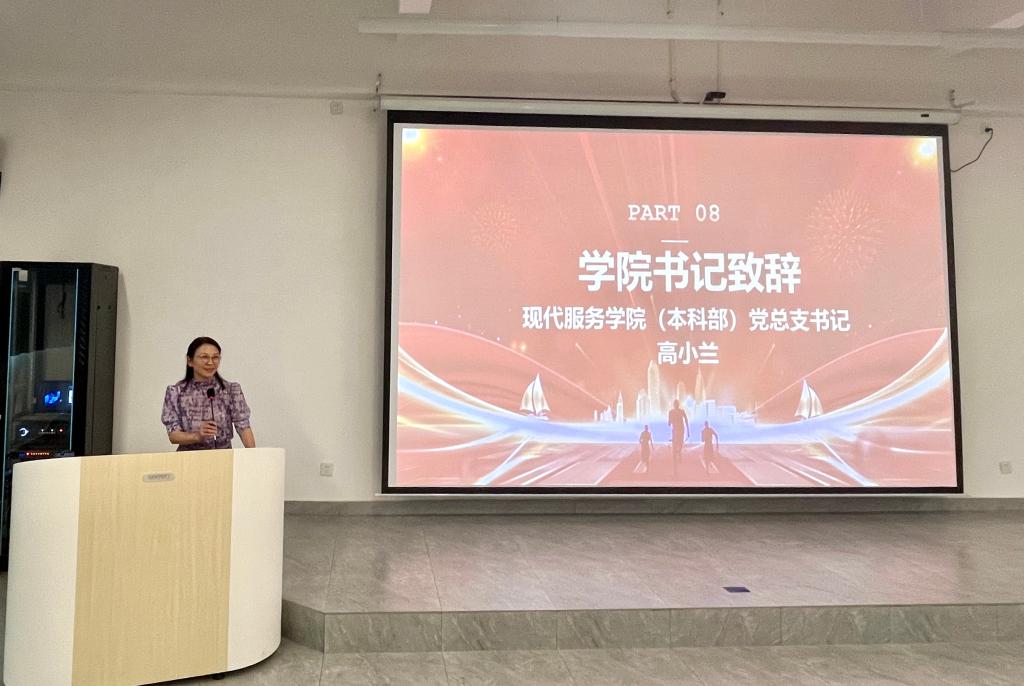 现代服务学院(本科部)党总支书记在致辞中,像大家长般亲切地告诉新生们,大学是人生最宝贵的成长阶段,希望大家既要仰望星空,也要脚踏实地。她建议同学们尽快适应新环境,学会独立生活,与室友友好相处;认真对待每一门课程,扎实打好专业基础,切勿虚度光阴;积极参加社团活动,拓展兴趣爱好,提升团队协作能力,提高个人素养。她要求同学们做到“六个会”:会阳光、会做人、会求知、会做事、会生活、会爱校。此外,她鼓励同学们在接下来的军事训练中,发扬不怕苦、不怕累的精神,磨炼意志品质,培养优良作风,以饱满的精神状态上好大学生活重要的第一课。