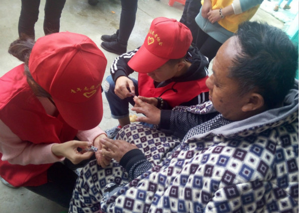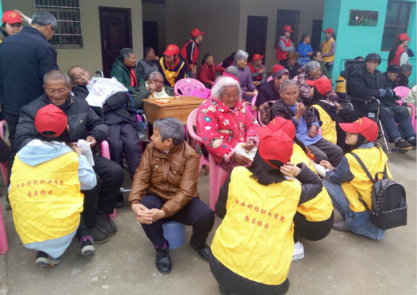 下午二点三十分,志愿者一行在指导老师的带领下,怀揣爱心,带着劳动工具和水果糕点来到进贤县长寿老年公寓。平日里十分安静的敬老院一下子热闹起来,处处活跃着志愿者们忙碌的身影:打扫卫生、整理内务,帮老人梳头、捶背、按摩,和老人促膝交谈,为老人们表演精心准备的节目。
