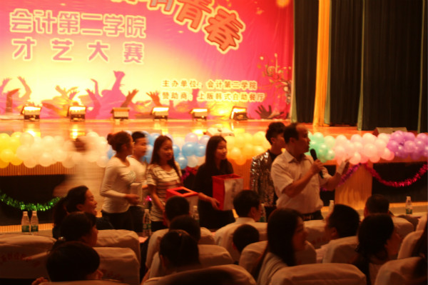 会计第二学院领导和评委老师为获奖选手颁奖。整场晚会始终沉浸在台上台下热情互动氛围之中。