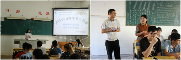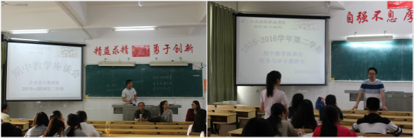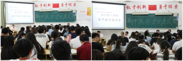 第三阶段——以教研室为单位召开的教学座谈会。5月5日下午,以教研室为单位分别在教学楼408、409、410、411教室召开了期中教学座谈会。此次座谈会主要由各专业教师面对学生代表,各教研室主任及各课程组教师代表与我院14、15级近200名学生代表共同参加了此次活动。座谈会上气氛热烈,同学们畅所欲言,分别围绕课程设置、教学内容、教学方法与方式、教学效果、职业资格证书考试等主题提出了自己的困惑与建议。与会的教师认真听取了意见并进行了详细的记录与解答。针对部分同学所提出的企业会计业务核算、企业财务管理、财务报表审计、成本核算实务、财税信息化及会计基础实训等课程的学习方法问题,与会的领导、老师也与同学们进行了深入的交流并提出了许多宝贵的建议。