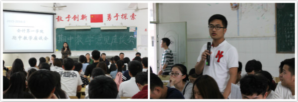 第二阶段——学院教学座谈会。5月4日下午会计第一学院在教学楼408教室组织召开了2015-2016学年第二学期期中教学座谈会,学院党政班子领导和各教研室主任出席座谈会,来自学院14、15级各班120余名学生代表参加了座谈会。座谈会上,与会学生代表主要围绕学院目前在课堂教学、教学安排、教学条件、教学管理等几个方面存在的问题,积极发言,认真反馈平时收集、了解到的教学相关的信息。学生代表们在发言中对绝大部分教师的教学给予了充分的肯定,对个别教师在教学过程中存在的不足提出了意见和建议,同时也对学院教学条件、教学管理方面给出了建议。