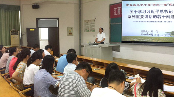 根据学院“两学一做”实施方案的要求和思政教务支部“两学一做”工作方案的安排,2016年6月15日下午,思政教务党支部在综合楼阶梯教室6开展了“两学一做”第一专题党课学习教育活动。