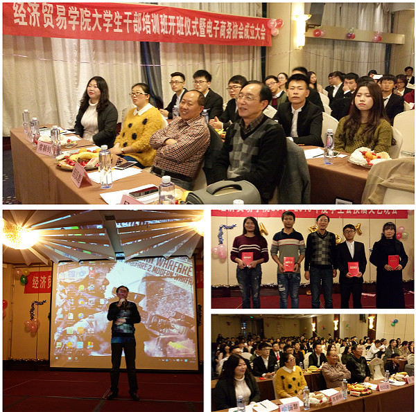 近年来电子商务发展迅速,bat365电子商务专业学生迅速发展,已接近400人,为增强同学们电子商务技能,培养大学生创业意识,营造更好的学习、实践氛围。11月14日下午,经济贸易学院在远洲大酒店阳光厅举办了大学生干部培训班暨电子商务协会成立大会。经济贸易学院院长吴炜,党总支书记但汉彪,党政办公室主任崔晓慧,团总支书记席颖钊,办公室喻杨慧老师,出席大会。全体学生会干部、电子商务协会负责人参加会议。