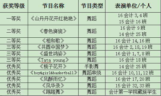 晚会在动感欢快、舞姿优美的舞蹈《共圆中国梦》中拉开帷幕;接下来由会计第一学院藏族学生带来独特风味的《踢踏舞》,为晚会增添了一丝丝轻松活跃的气息;舞蹈《山丹丹花开红艳艳》描述红军长征胜利抵达陕北时,正逢满山的山丹丹花开的美丽情景,让我们想起了老一辈革命先烈为了革命胜利,勇于奉献誓死保卫家园的精神;舞蹈串烧《boy&girl&basketball》编排新颖,构思独特,让现场观众耳目一新;会计第一学院班主任王焕老师带来的脱口秀《不想长大》,将刘德华、杨坤等人模仿的惟妙惟肖,全场观众都为他喝彩;古风典雅的群舞《风酥雨忆》清新高雅、超凡脱俗、美不胜收;接下来有财税金融学院的魏旻书记等表演的《十送红军》,优美的舞姿与古典乐器融合,可谓荡气回肠;歌曲《亲密爱人》美妙动听,余音绕梁,绵延不绝;舞蹈《相和歌》完美地将鼓与舞蹈融合在一起;搞笑的小品《校园女主角》再一次让观众为之鼓掌,齿牙春色;欢快的印度舞《Tata young》动感十足,展示了当代大学生的靓丽风采;晚会在手影舞《栀子花开》中圆满落幕,表达了bat3652014级应届毕业生对学院的不舍之情和美好祝福。整场晚会精彩纷呈,高潮迭起,给现场观众奉献了一场难忘的视听盛宴。